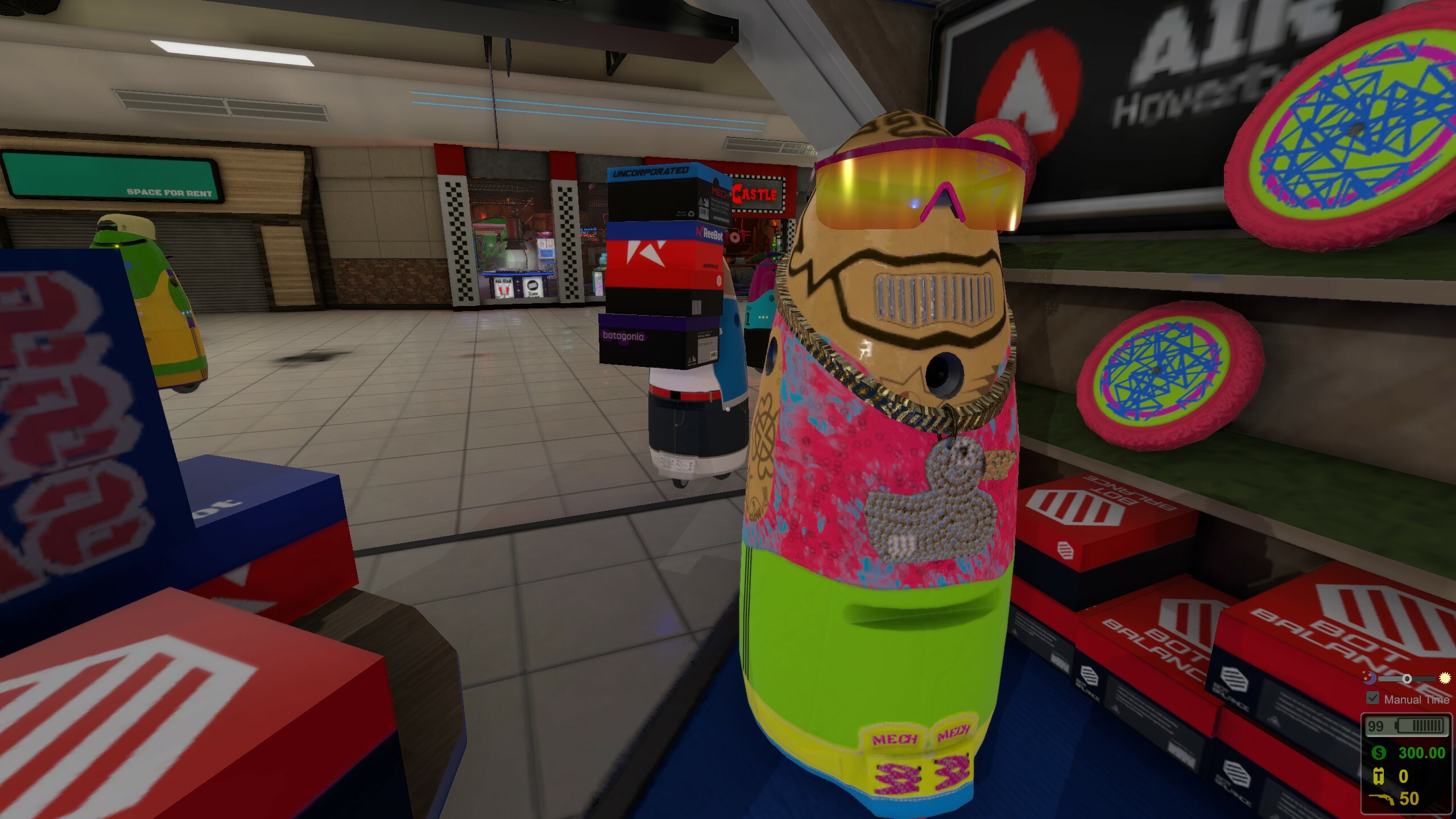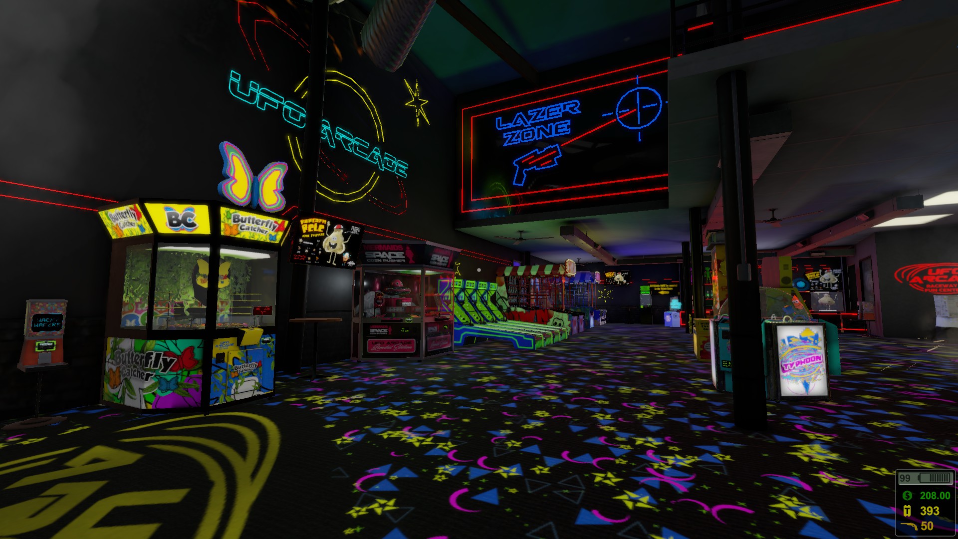 To be fair, there’s a decent amount going on. You’ve got loads of arcade machines, bits of open-world exploration, and a survival mode that adds some light stakes without being overly punishing. The day-night cycle ticks along nicely, and earning money through odd jobs or flogging prizes has a certain scrappy charm. There’s also a weird, slightly unhinged vibe to the whole place – robots wandering about, odd little secrets tucked away – which at least keeps things from feeling completely lifeless.